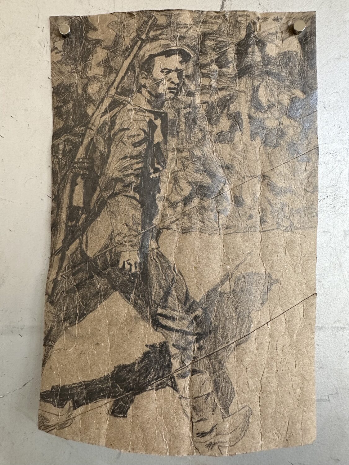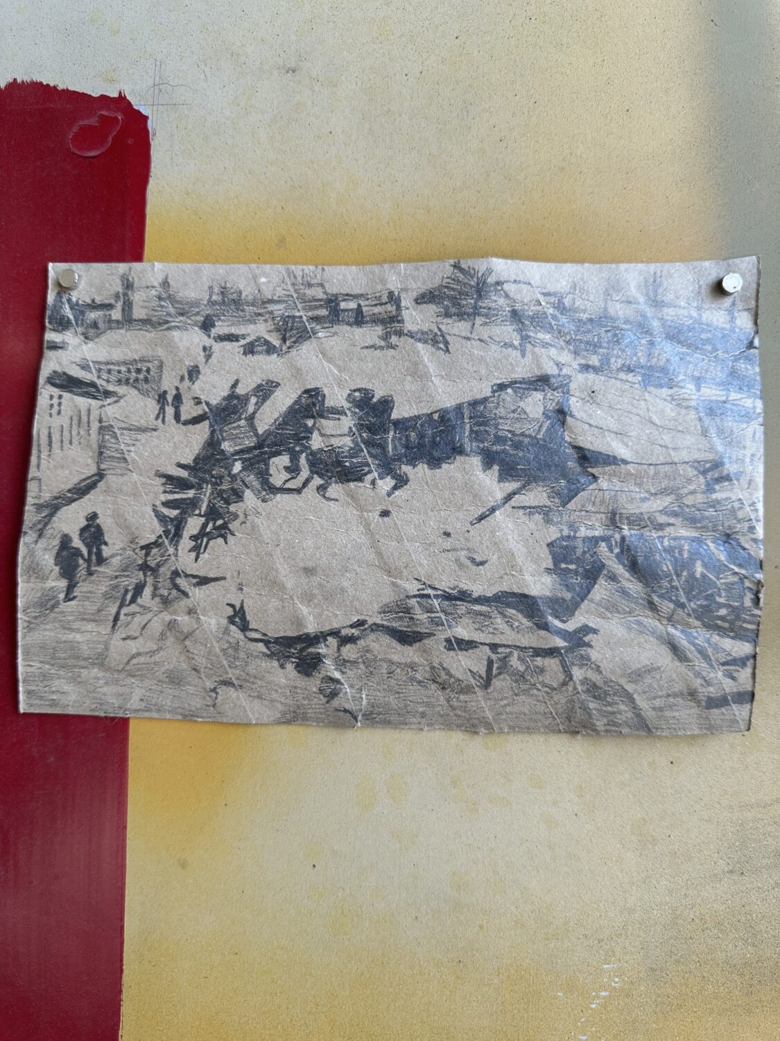Otava Metsätähti, Kauhakuormaajat työnsivät Nurmeksen vanhan sairaalan yön pimeydessä hirsikasaksi, Sarjasta Mitä, missä milloin, 2025, grafiitti talouspaperirullalle, 14 cm x 22 cm.