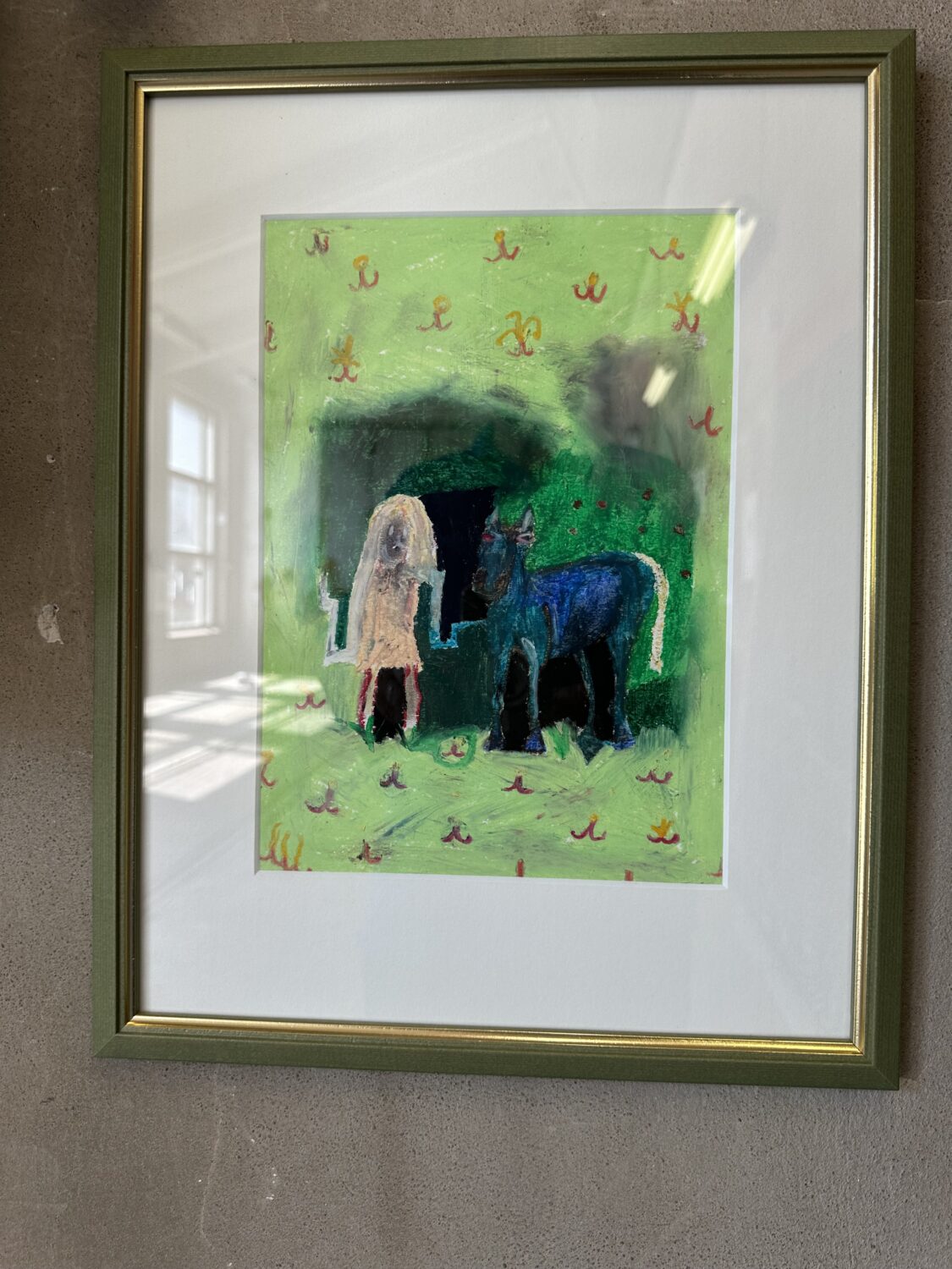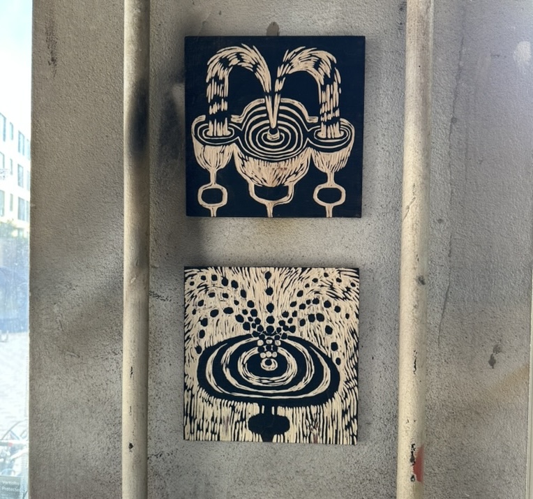 Arttu Hartikainen, Heppa ja tyttö, 2025, öljypastelli Saimi Hakala, Lähde 1-2, puupiirros koivuvanerille, 29,7 cm x 21 cm. 20 x 20 cm, 2025