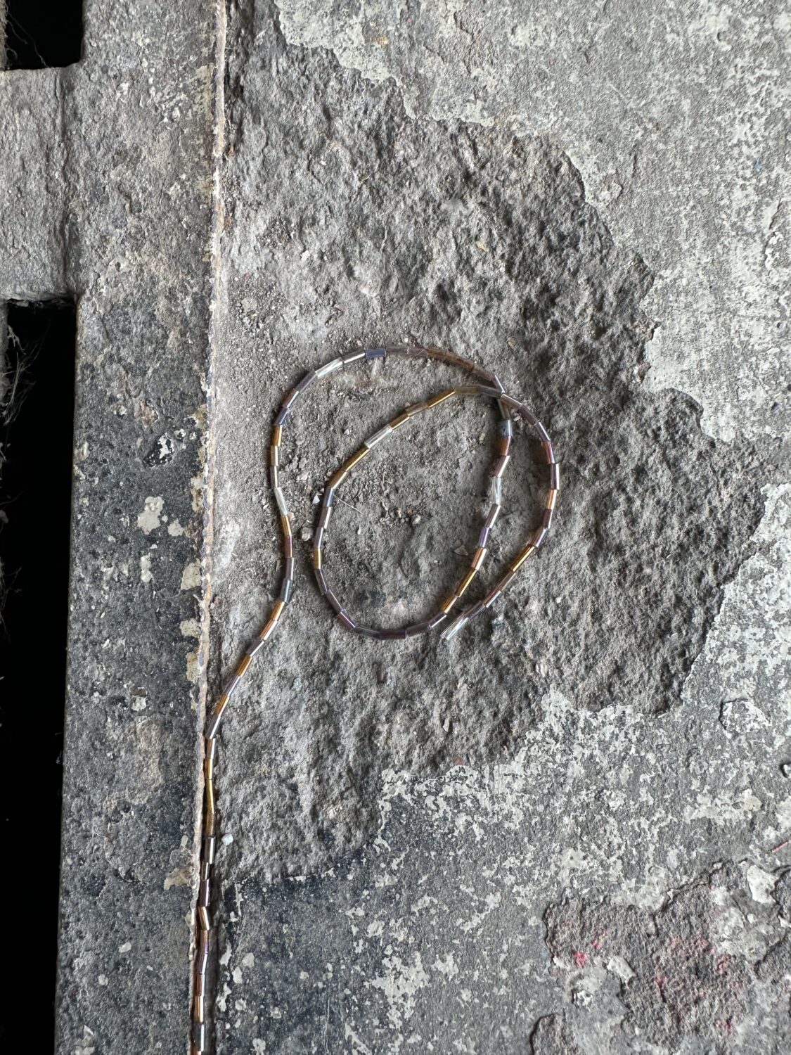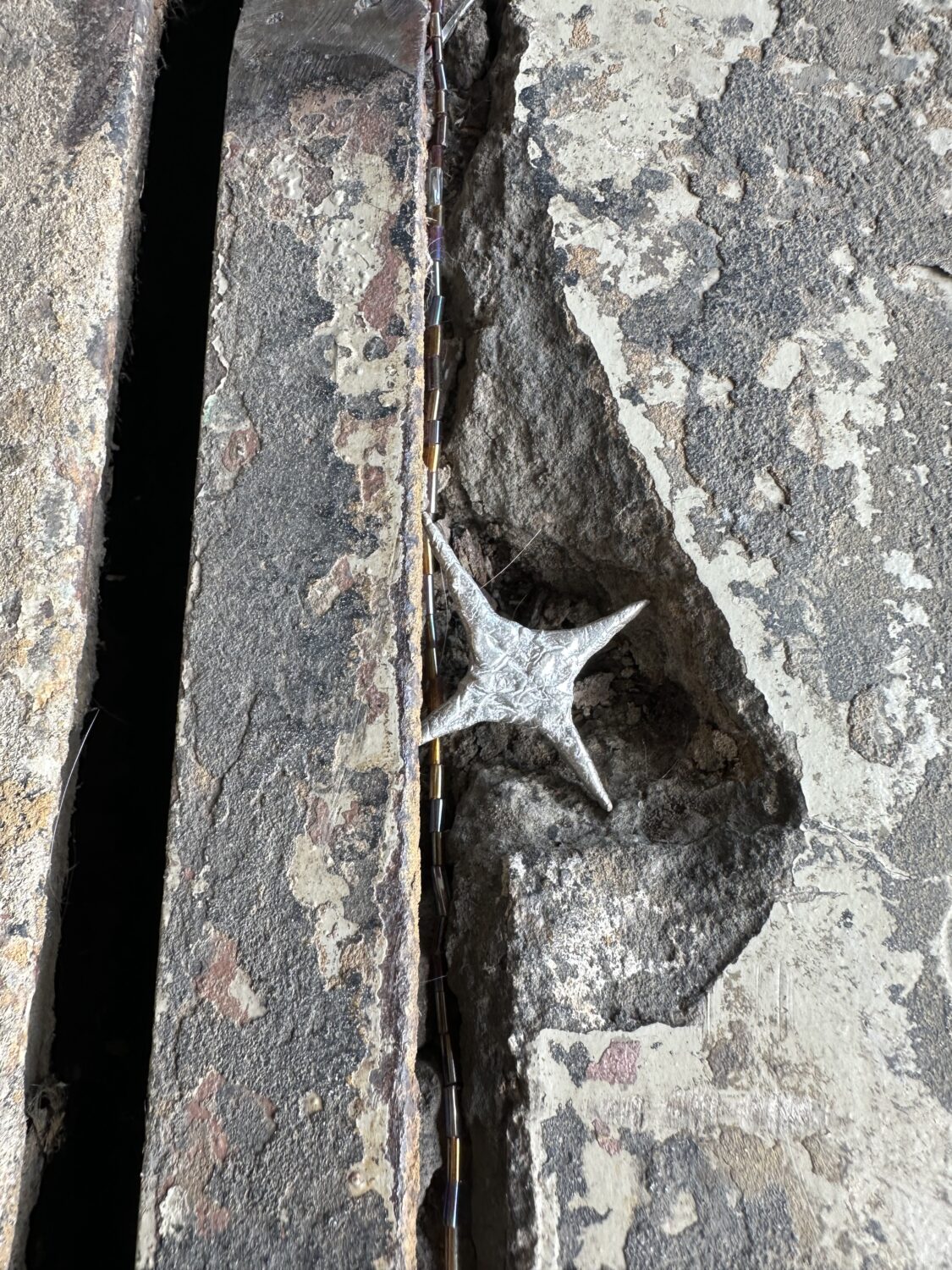 Aleksandra Kuokkanen, Cross Hole, 2025, installaatio; lasihelmet, siima ja hopea
