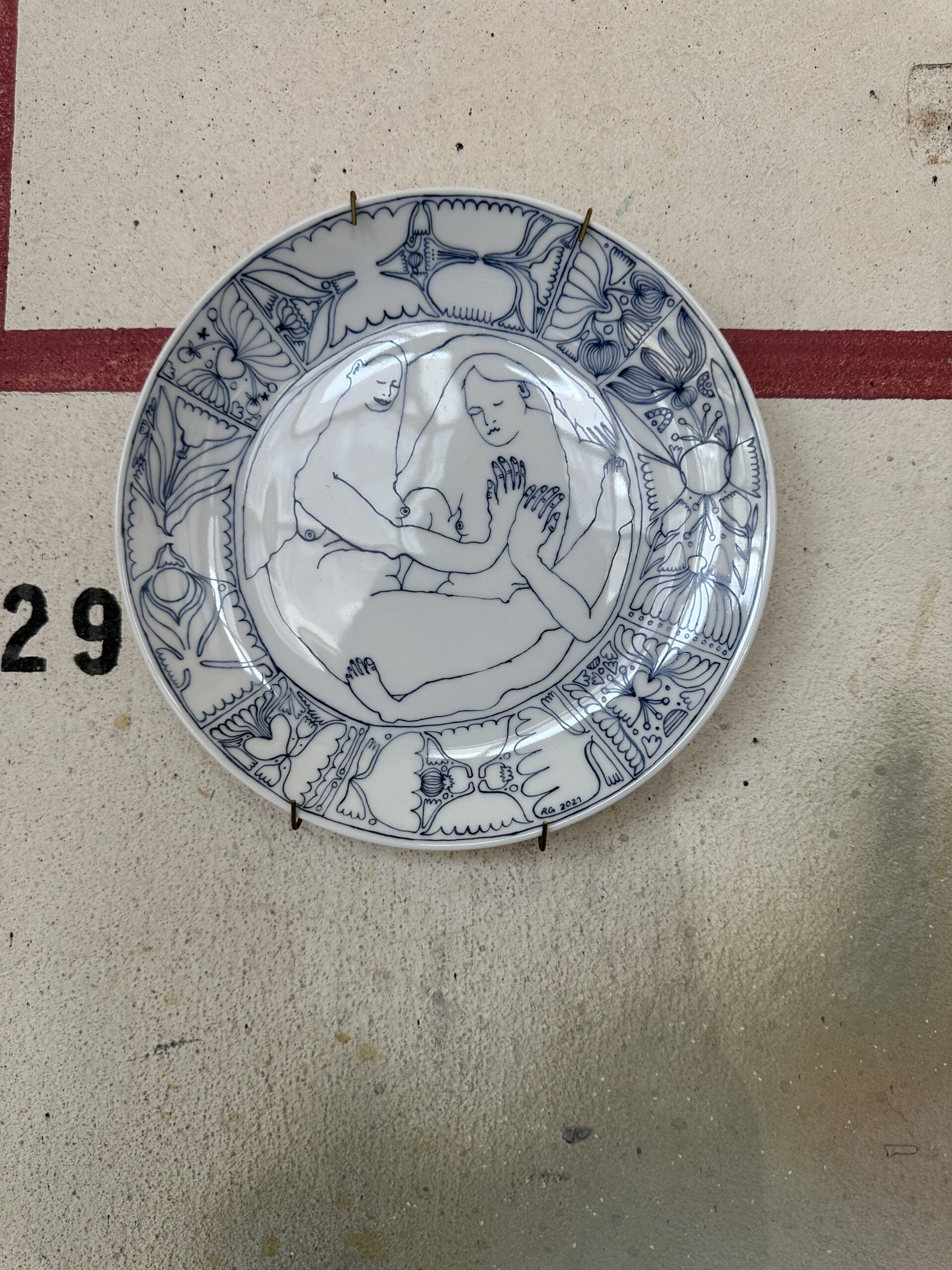 Riikka Gröndahl, Kaksi enkeliä, 2021, piirustus Maija Albrecht, Kasvotusten, à 24 x 4 cm, kierrätysposliinille, halkaisija 20,5 cm. kuivaneula ja värikynä, 2024 ja värikynä, 2024