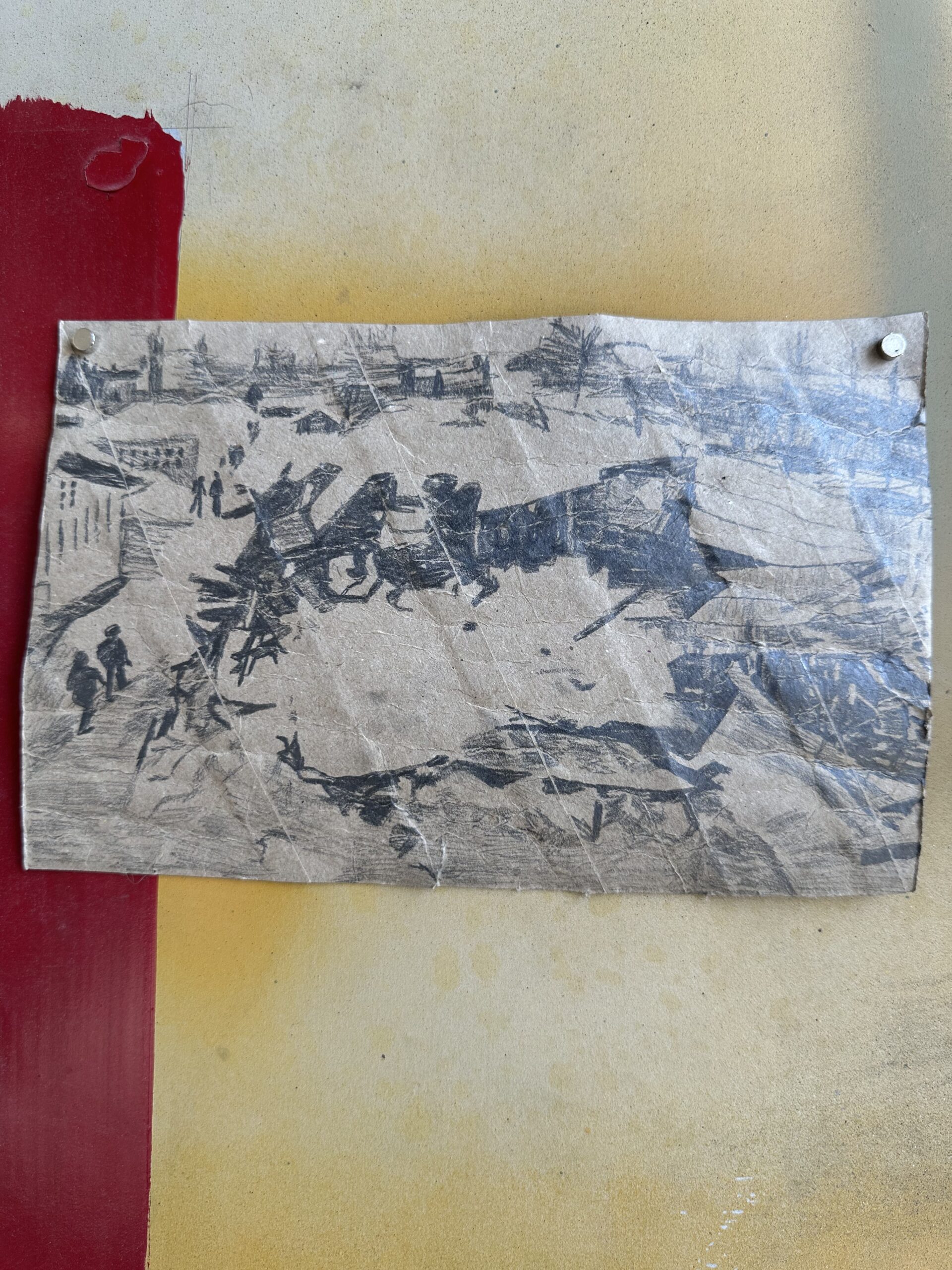 Otava Metsätähti, Kauhakuormaajat työnsivät Nurmeksen vanhan sairaalan yön pimeydessä hirsikasaksi, Sarjasta Mitä, missä milloin, 2025, grafiitti talouspaperirullalle, 14 cm x 22 cm.